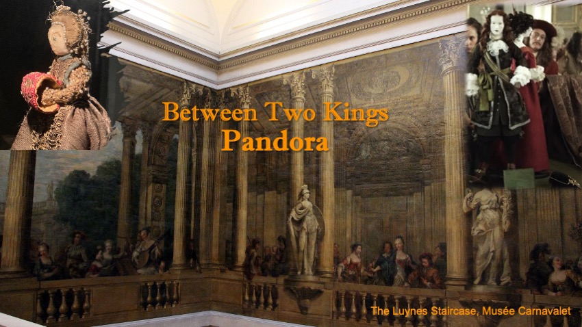 M. de Guiche raises a brow indicating he agrees, and he guides them further inside. Although it is a gray winter day, the gold-plated candelabras and the opulent crystal chandeliers create a dazzling display of lights that are reflected on the marble floors and in the large mirrors which have been lined along one of the walls, across the windows. The mirrors are meant to allow guests to admire themselves as they walk around the hall, sampling an array of exquisite fabrics, lace, feathers, furs, hair ornaments, hats, gloves, jewels, and shoes that are exhibited on large tables in the middle of the hall. Everything is arranged in the most alluring combinations of color and texture, around a series of beautiful porcelain dolls, those the French call poupées de mode and the English call Pandoras. Each doll is fully dressed in a complete, miniature outfit for a lady or gentleman using a specific combination of colors, fabrics, and accessories, every detail carefully crafted as if this is the real costume. The other side of the hall is furnished with tables decorated with candied fruit and flowers, and sculptures of animals made of sugar. There, guests can enjoy the finest assortment of dishes, savory and sweet. Wine and champagne flow freely, and, somewhere hidden from view, a small group of musicians adds soft, discreet melodies, to the fragrant air.