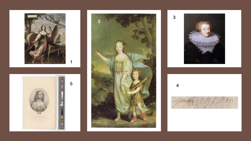 1. Attributed to Claude Deruet , Portrait of Marie de Rohan, Duchess of Chevreuse (1600-1679) as Diana the Huntress (circa 1627), Palace of Versailles; 2. Marie with her son Louis Charles; she poses as Diana and her son as Hercules; 3. Entourage of Daniel Dumonstier , Portrait of Marie de Rohan, Duchess of Luynes (circa 1621), location unknown; 4. 1663 signature of Marie de Rohan, Duchess of Chevreuse; 5. “Marie de Rohan, connétable de Luynes, duchesse de Chevreuse” / engraved by Capewell & Kimmel from the original portrait.
