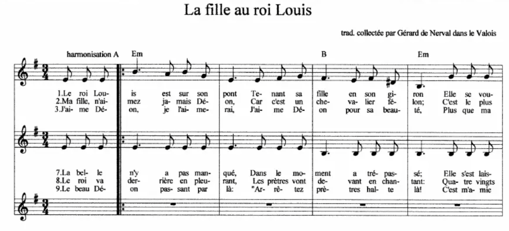 Chapter 40 (Phantasms of Love) uses the song “La fille au rois Louis” (The daughter of King Louis; Anonymous.) The song is dated sometime in the 15th or 16th c.